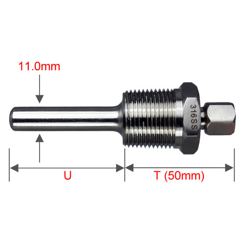 Note: Minimum sensor length = stem length (U) + 50mm. E.g. 50mm length thermowell is for a 100mm sensor.