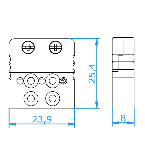 Miniature connectors for thermocouple and RTD circuits. Flat pin design. Accepts wires up to 0.6mm (4.5mm cable dia. max). Third connection for ground, or continuous shield connection, or for 3-wire RTDs. -50...+220°C max.