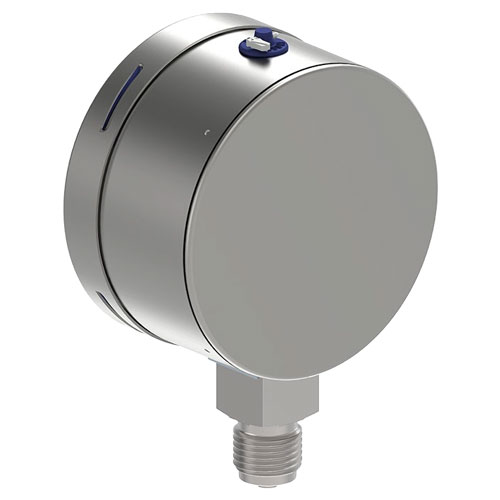 63, 100, 160mm diameter. Full safety pattern, baffle wall, blow-out back. Bottom or lower back entry. Various process threads. Pressure, vacuum and compound ranges available from -0.6 bar to 1600 bar (-10 psi to 20000 psi). Accuracy class: 1.0. Natural finish stainless steel case, stainless steel 316L wetted parts, IP65 rated, laminated safety glass window.